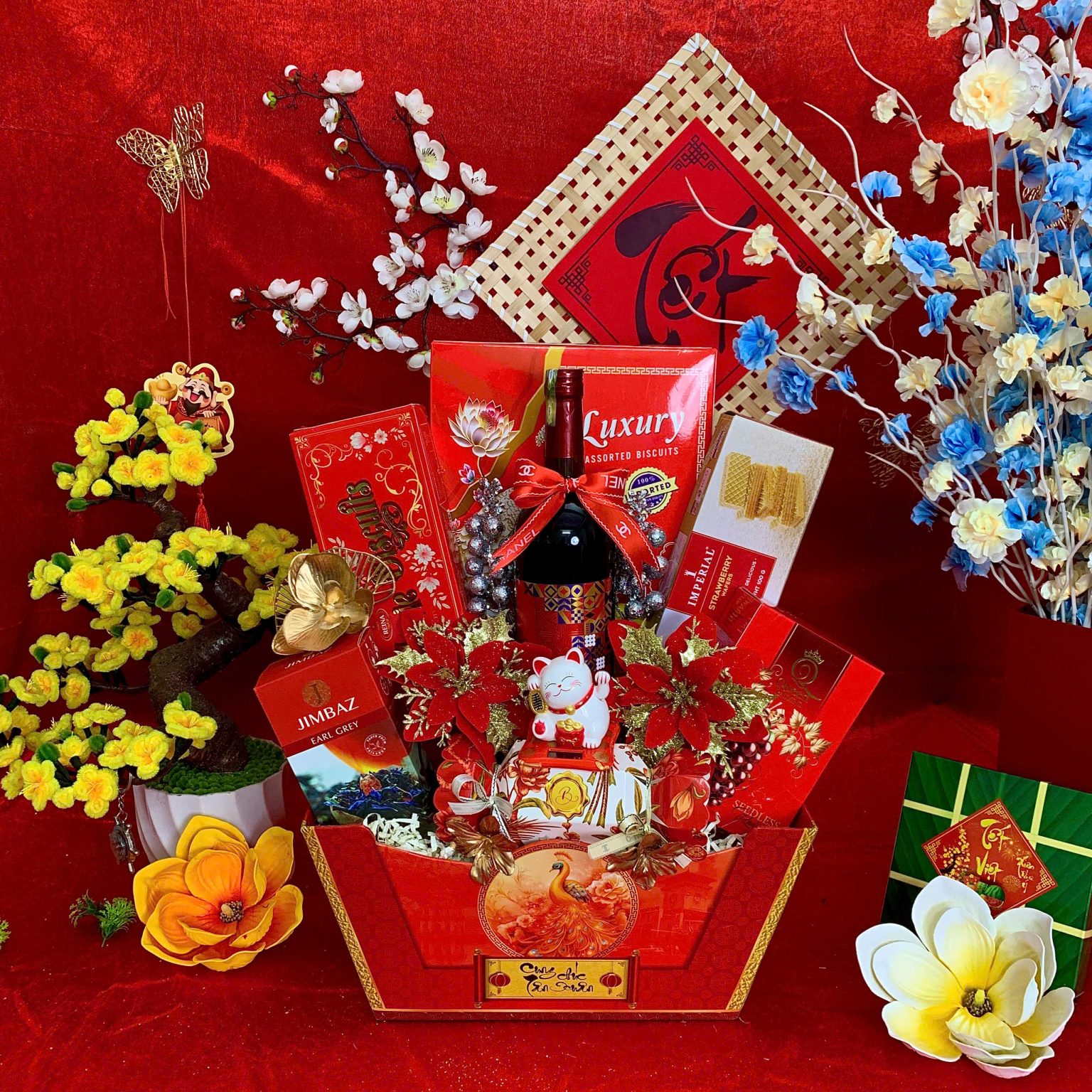 - Thiết kế sang trọng: Giỏ quà phối tông đỏ – vàng – xanh dương, tượng trưng cho may mắn, tài lộc và thịnh vượng.