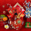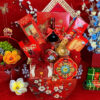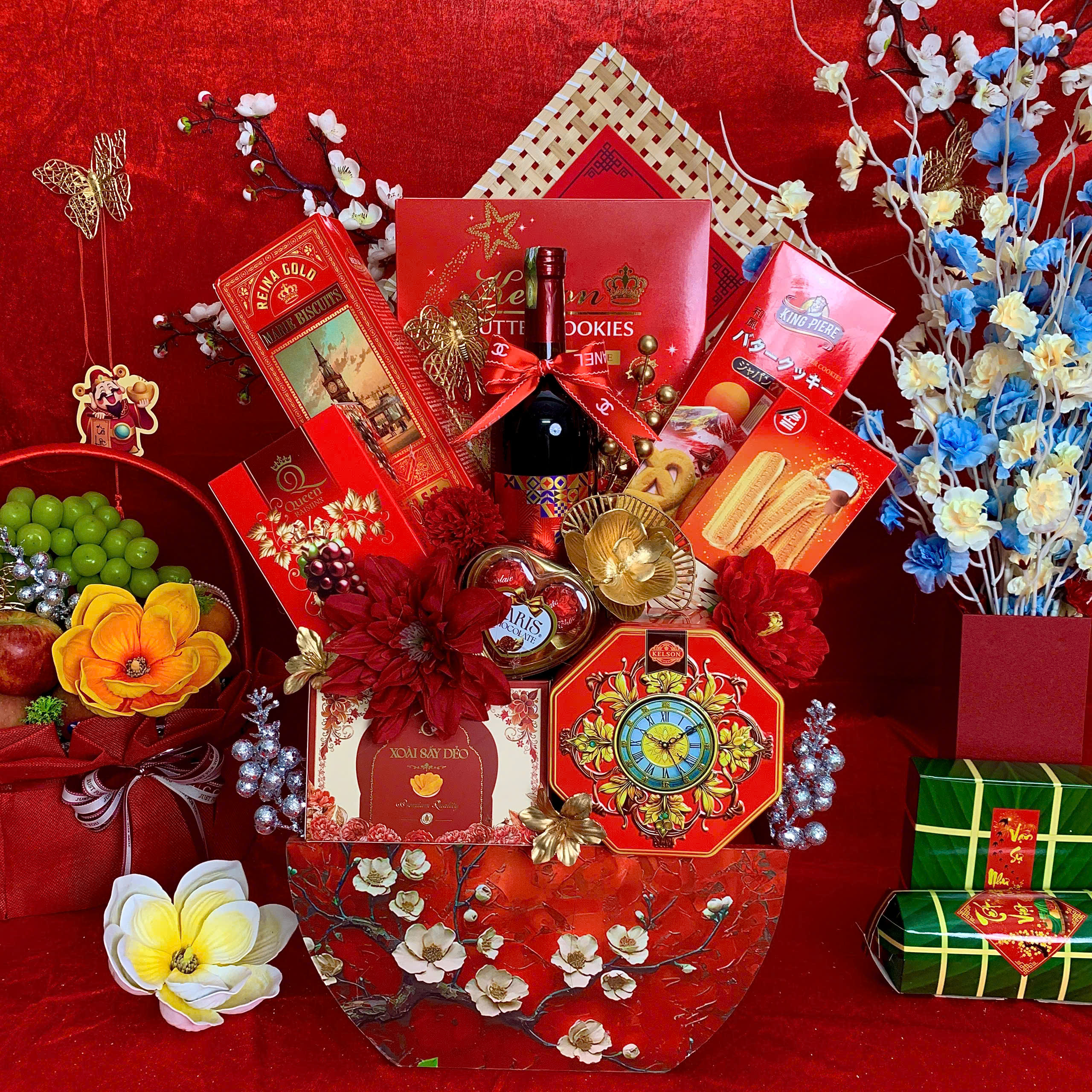 - Thiết kế sang trọng: Giỏ quà phối tông đỏ – vàng – xanh dương, tượng trưng cho may mắn, tài lộc và thịnh vượng.