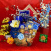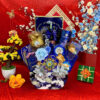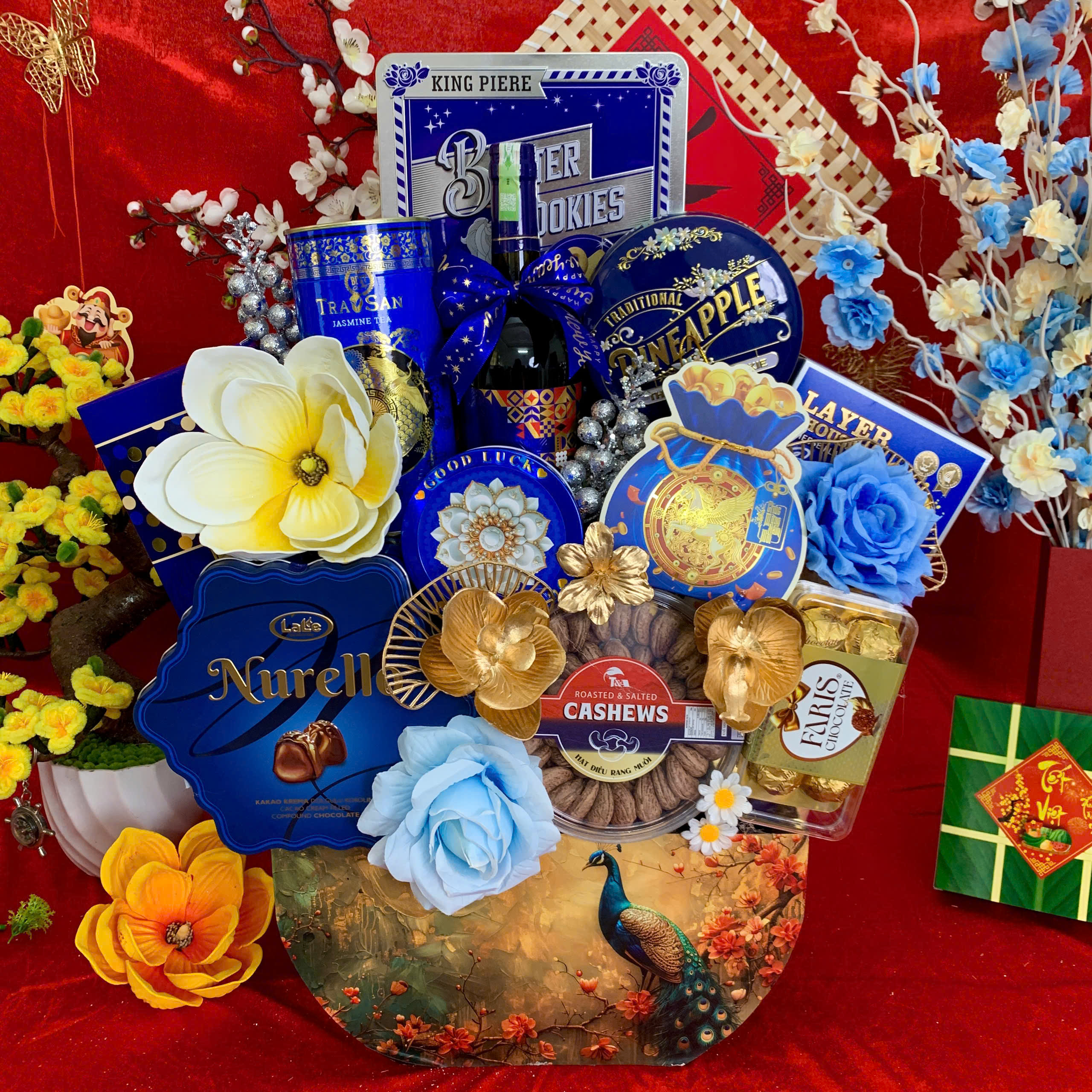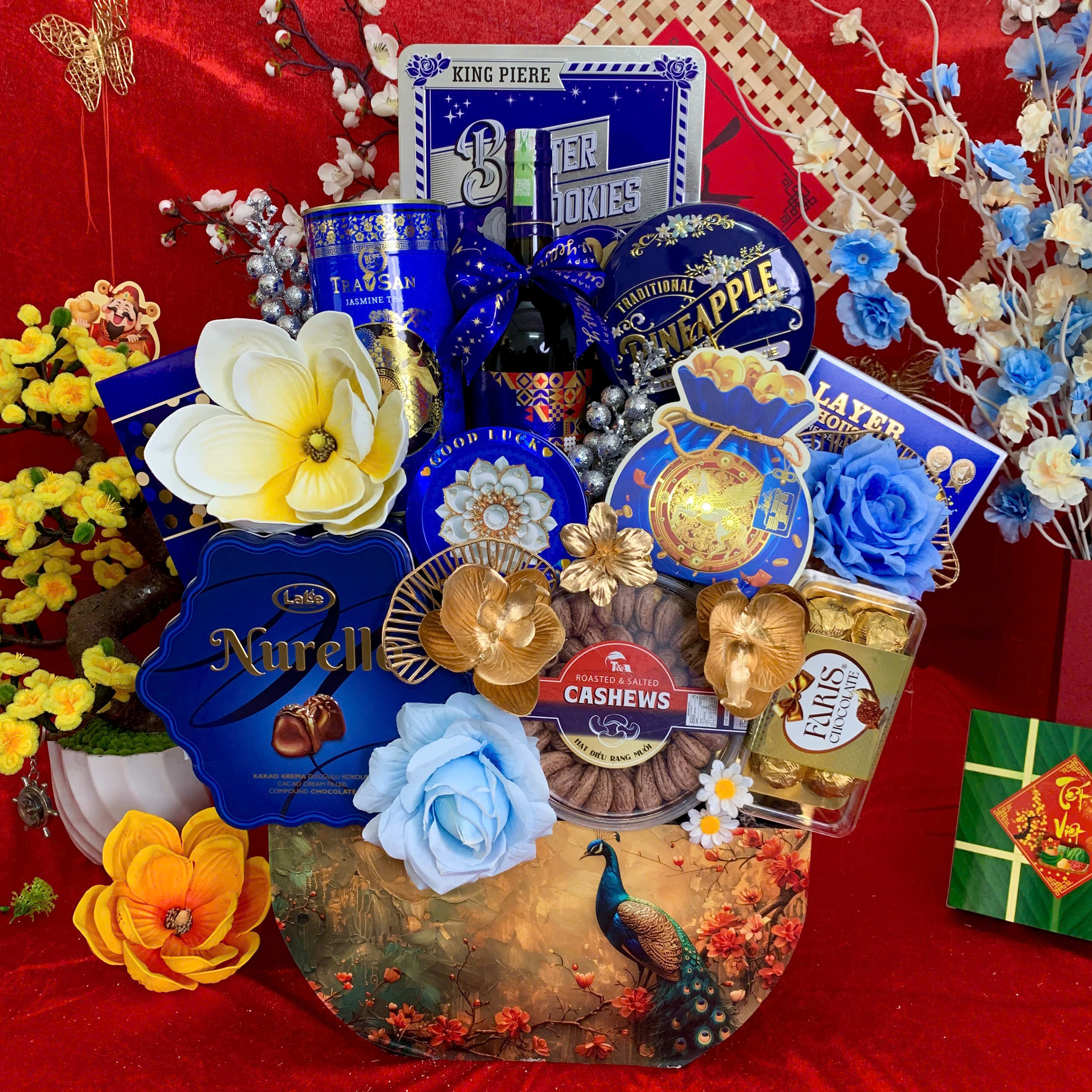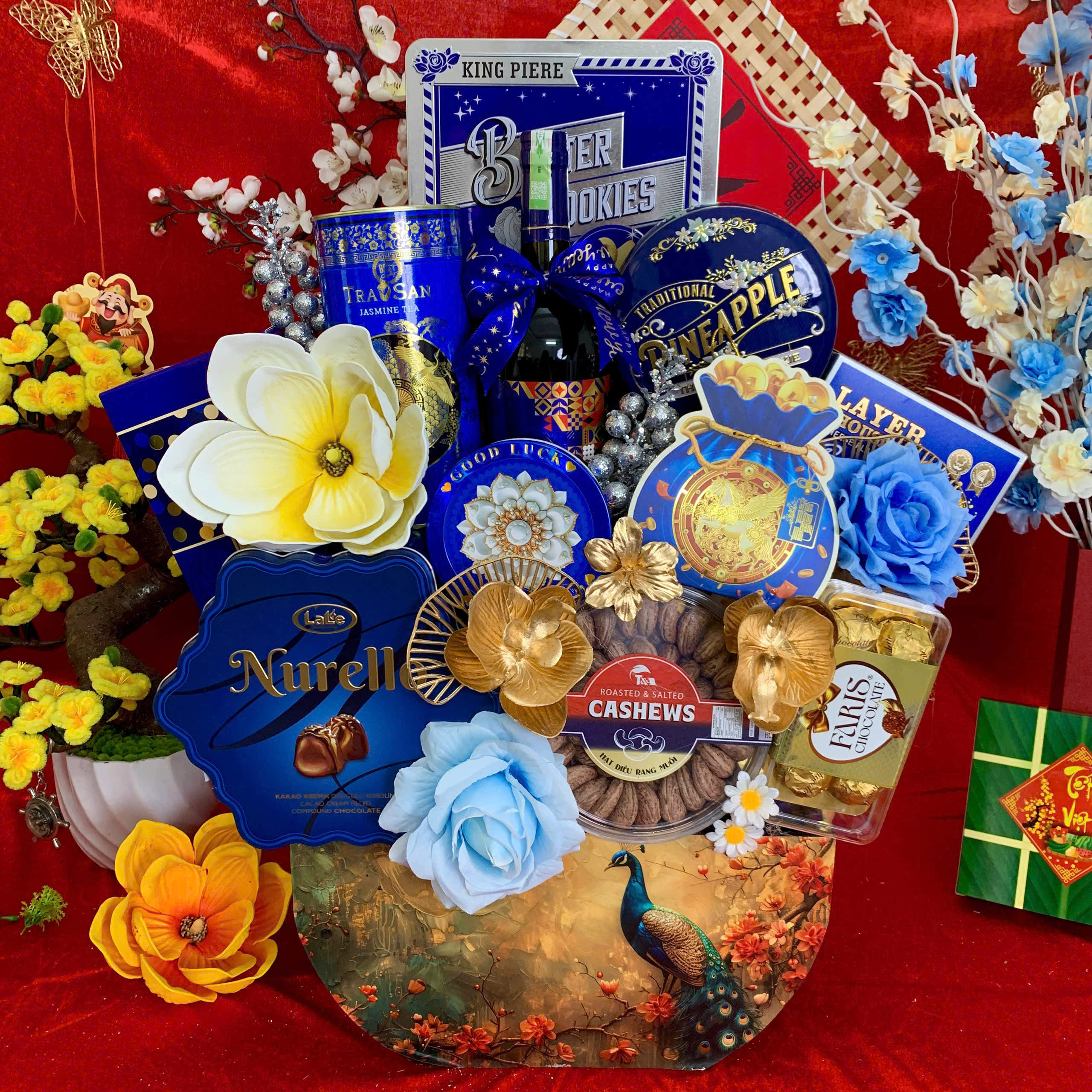 • Thiết kế sang trọng: Giỏ quà phối tông đỏ – vàng – xanh dương, tượng trưng cho may mắn, tài lộc và thịnh vượng.