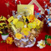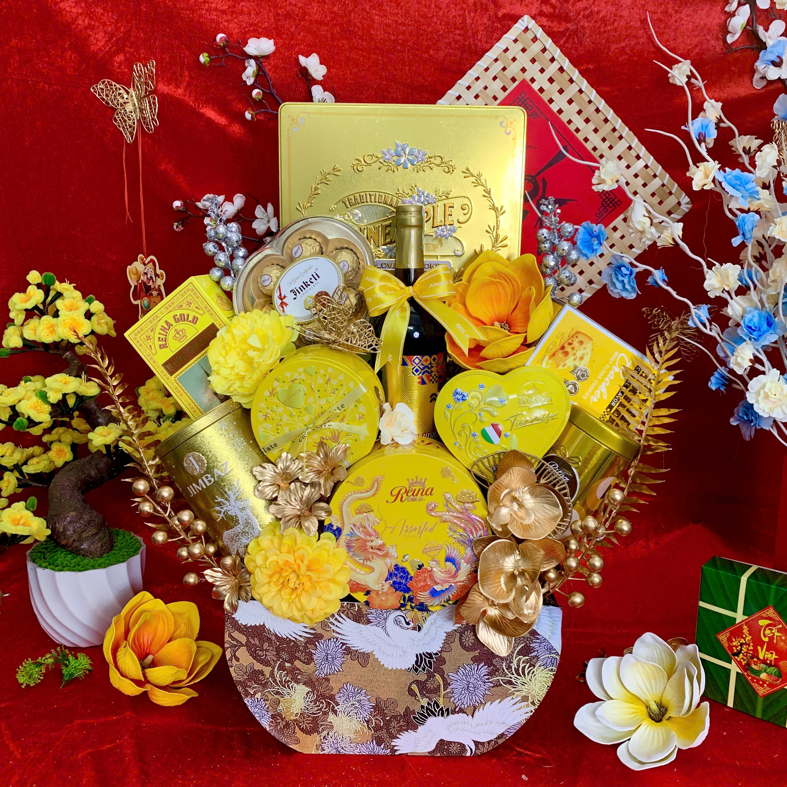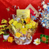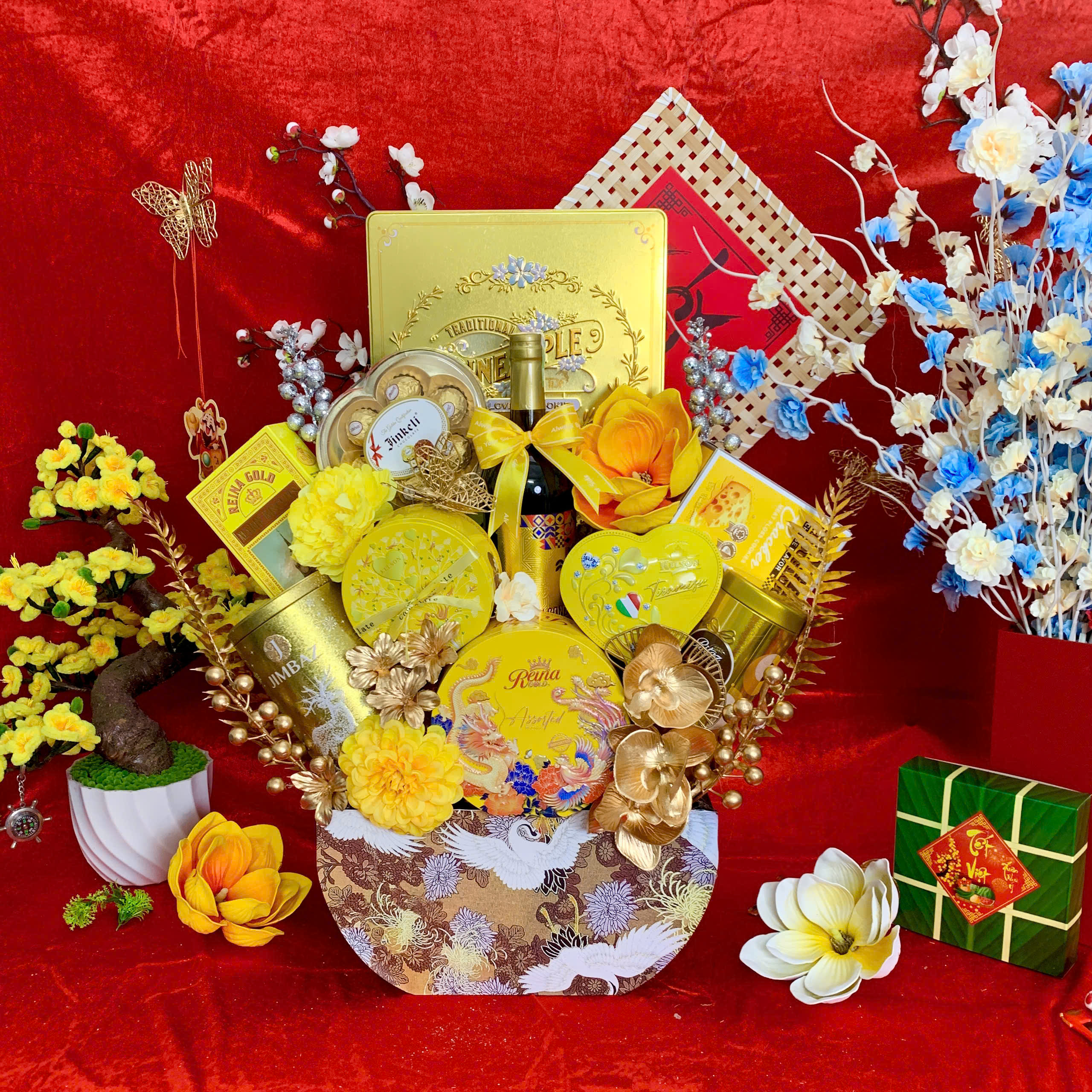 • Thiết kế sang trọng: Giỏ quà phối tông đỏ – vàng – xanh dương, tượng trưng cho may mắn, tài lộc và thịnh vượng.