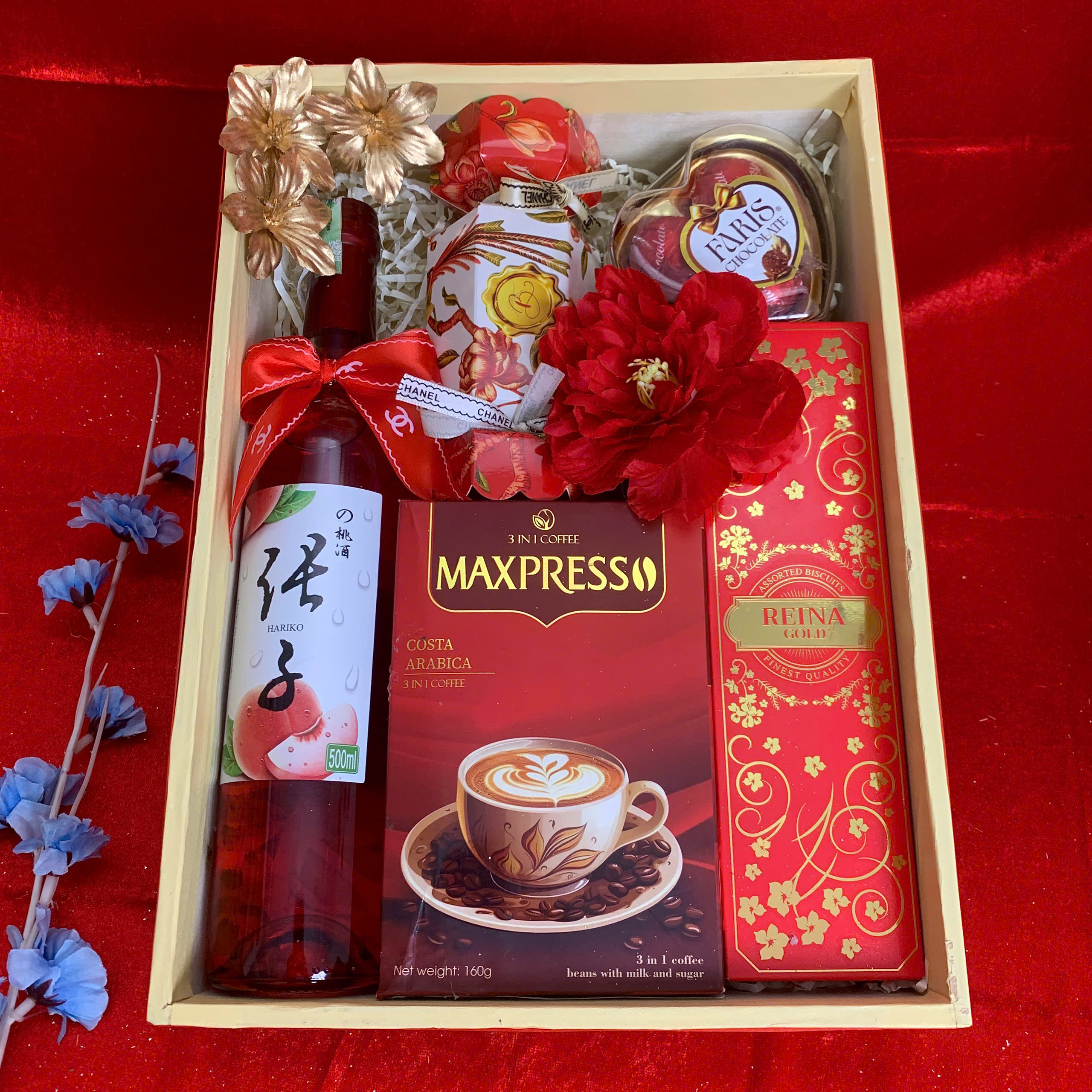 • Thiết kế sang trọng: Hộp quà phối tông đỏ – vàng – xanh dương, tượng trưng cho may mắn, tài lộc và thịnh vượng.