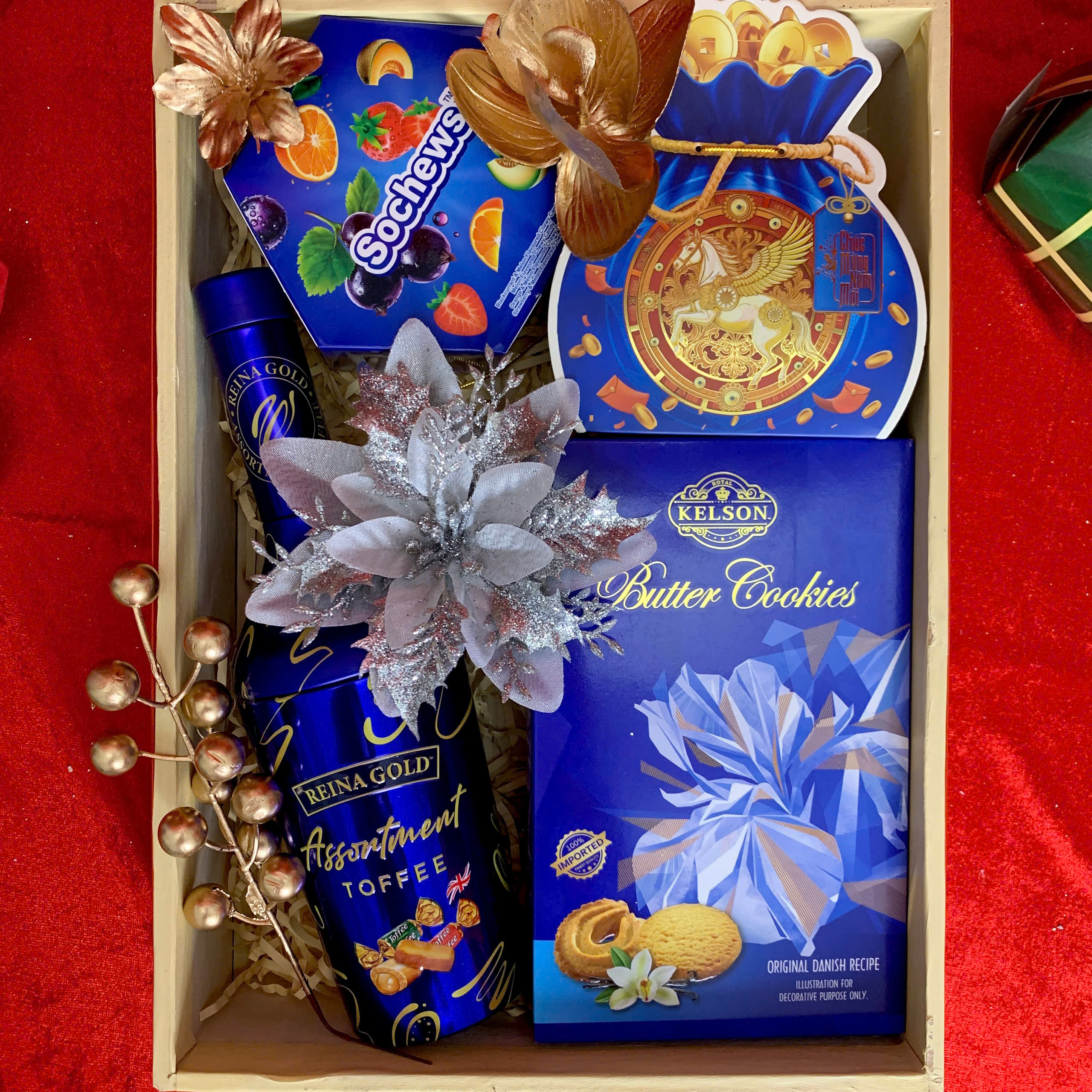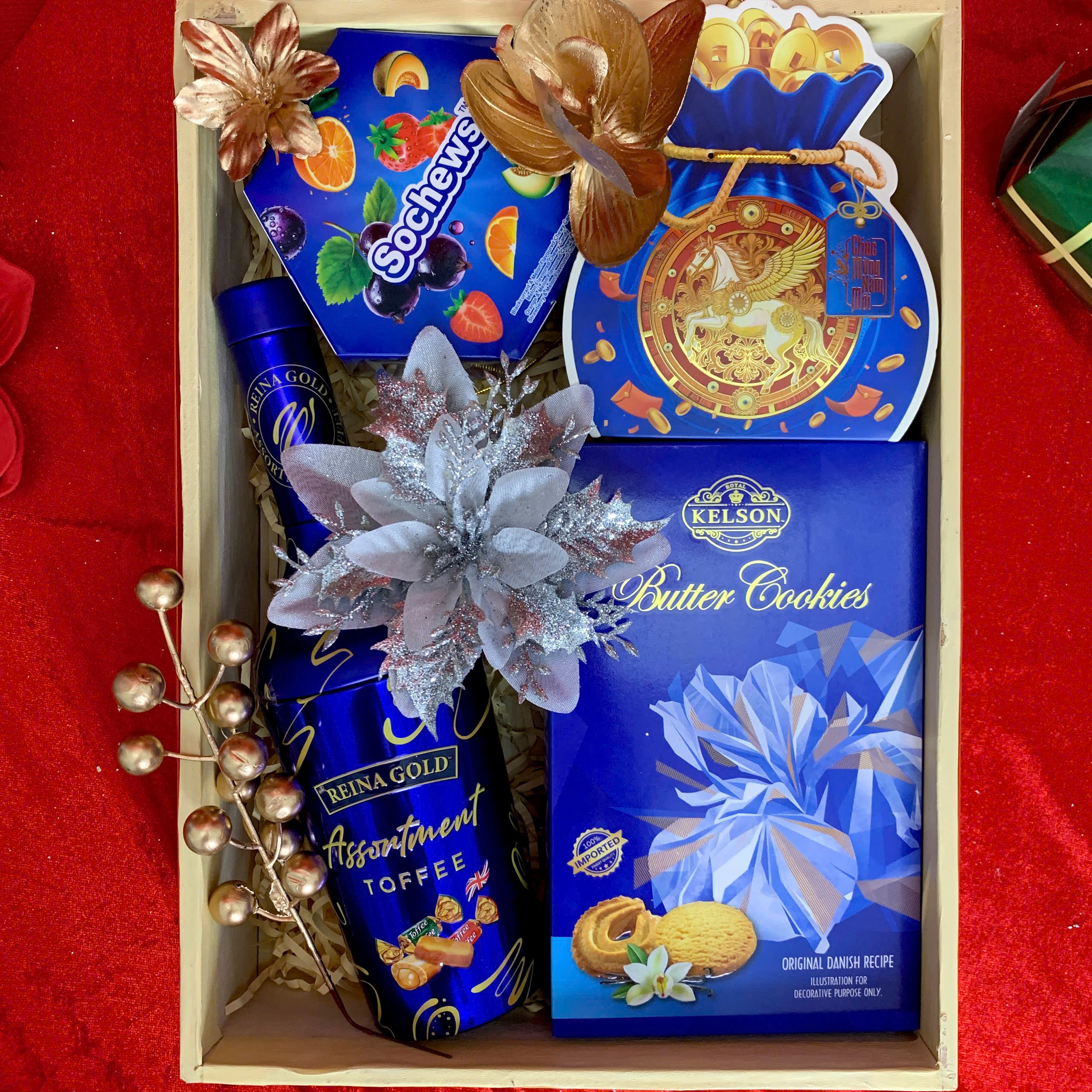 - Thiết kế sang trọng: Hộp quà phối tông đỏ – vàng – xanh dương, tượng trưng cho may mắn, tài lộc và thịnh vượng.