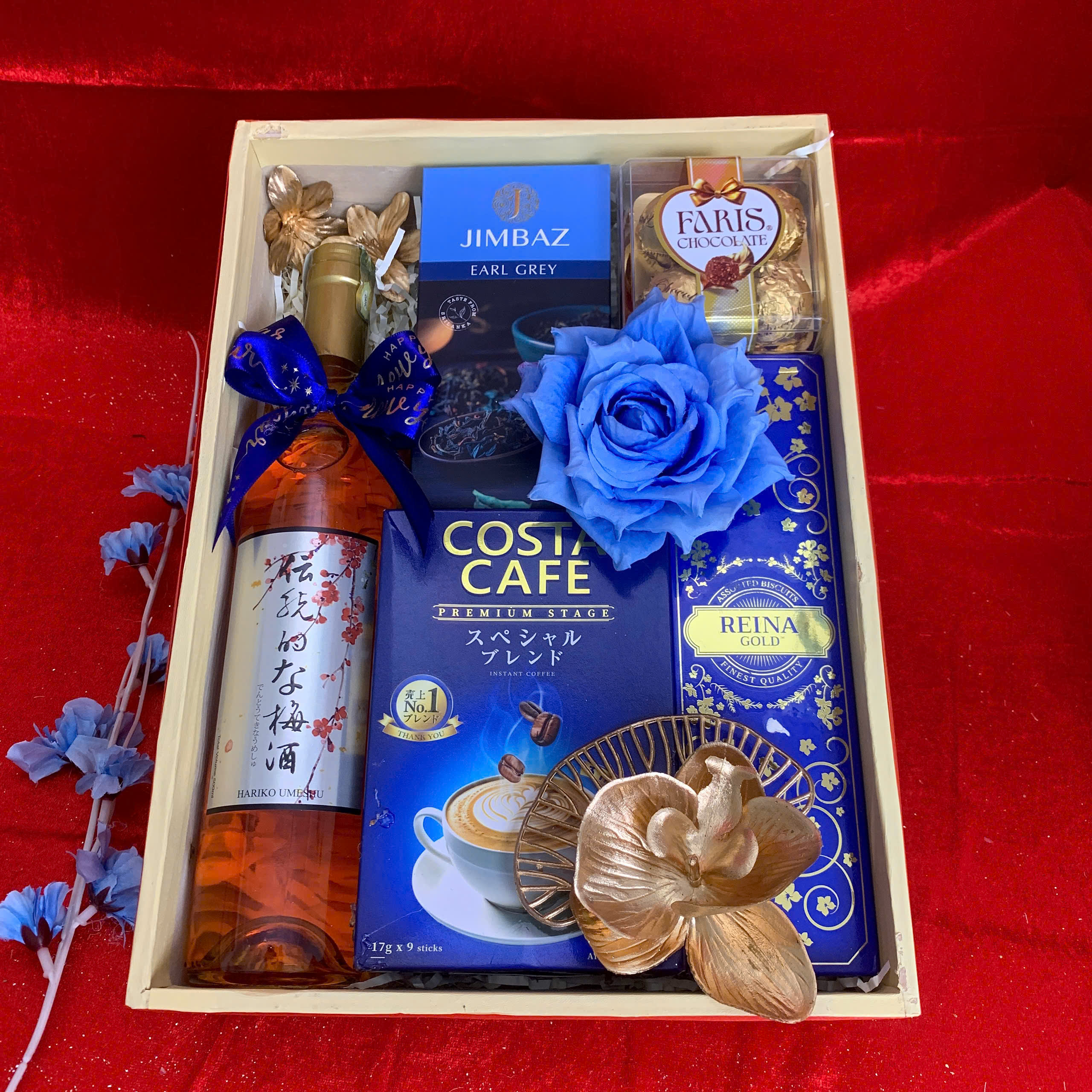 - Thiết kế sang trọng: Hộp quà phối tông đỏ – vàng – xanh dương, tượng trưng cho may mắn, tài lộc và thịnh vượng.