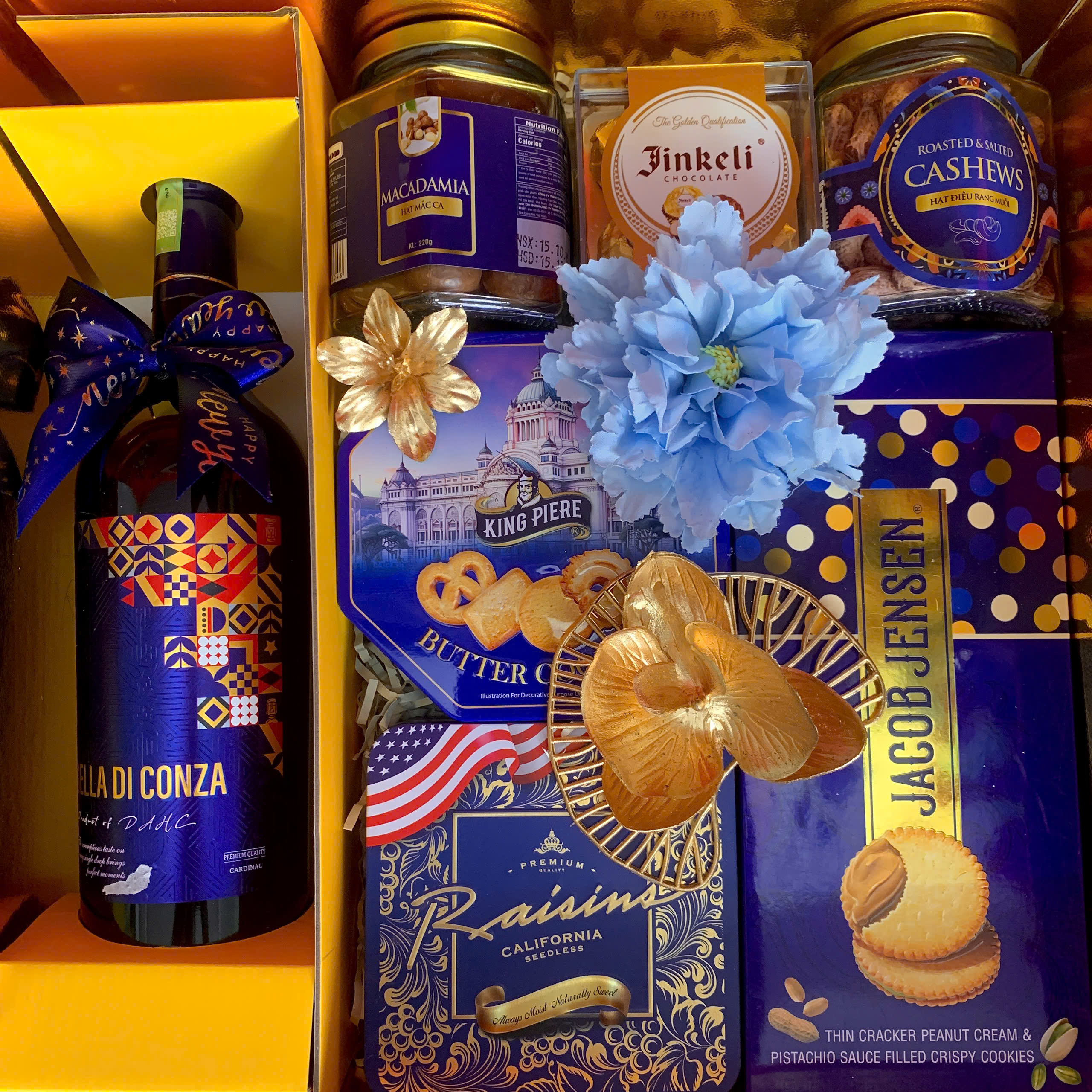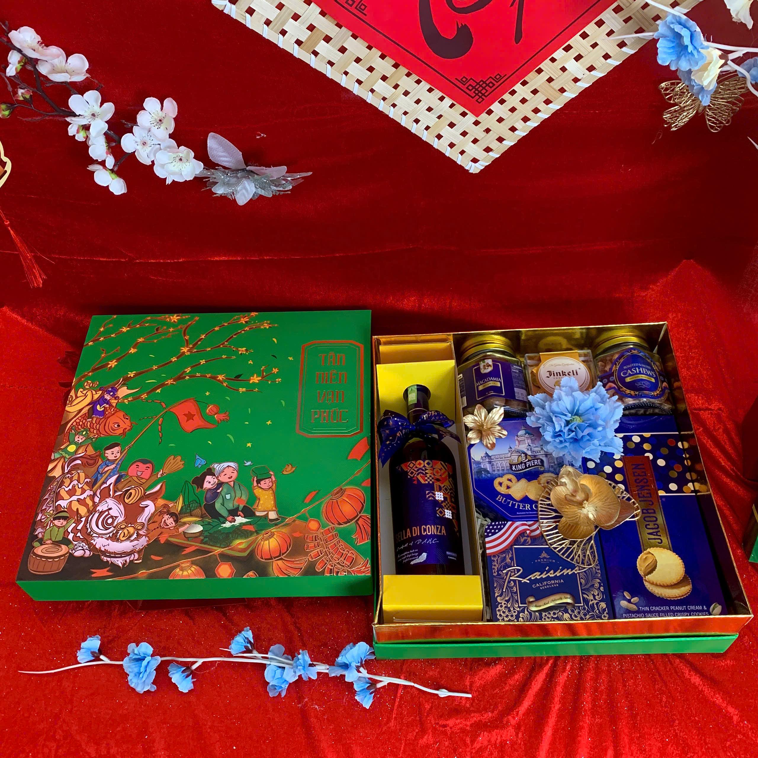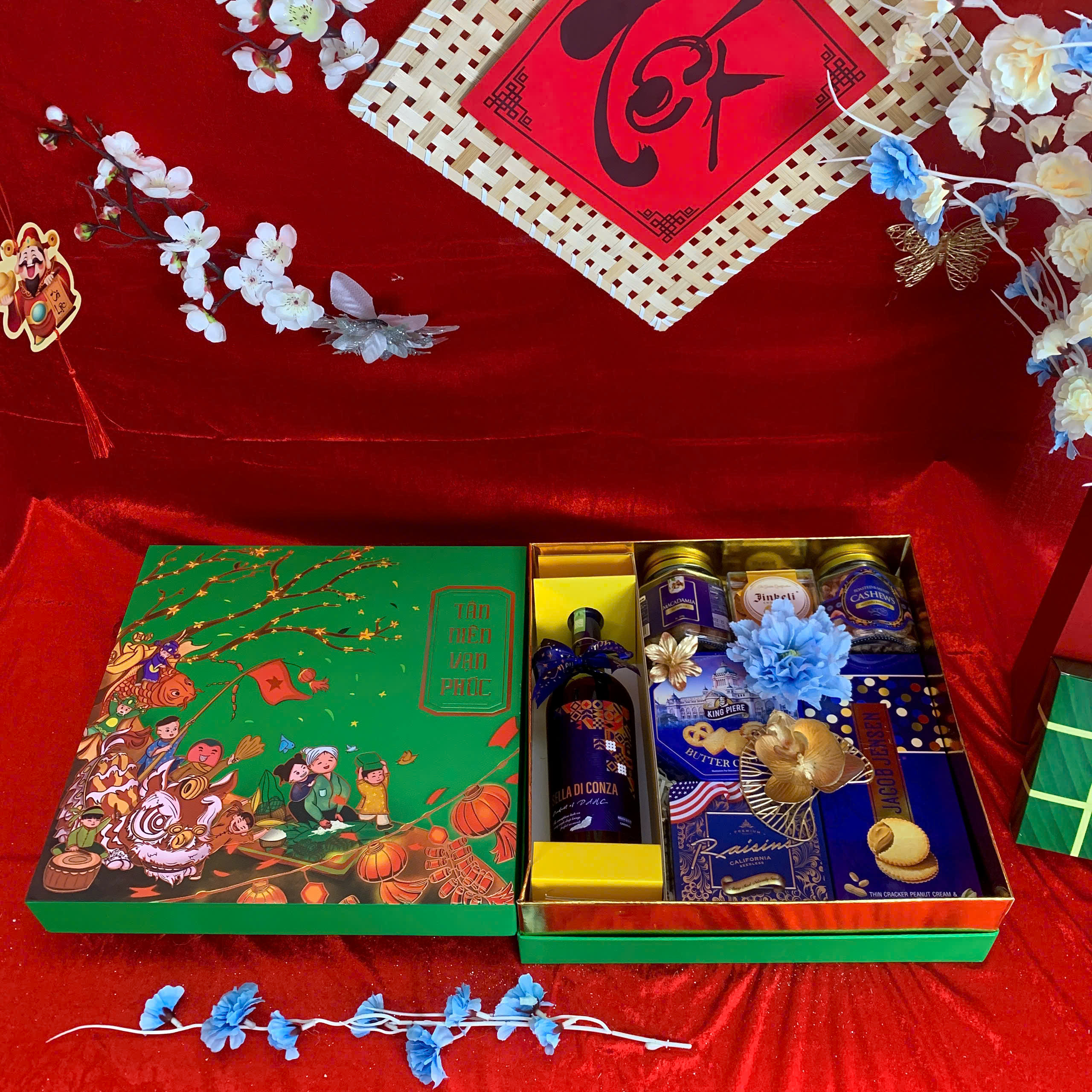 • Thiết kế sang trọng: Hộp quà phối tông đỏ – vàng – xanh dương, tượng trưng cho may mắn, tài lộc và thịnh vượng.