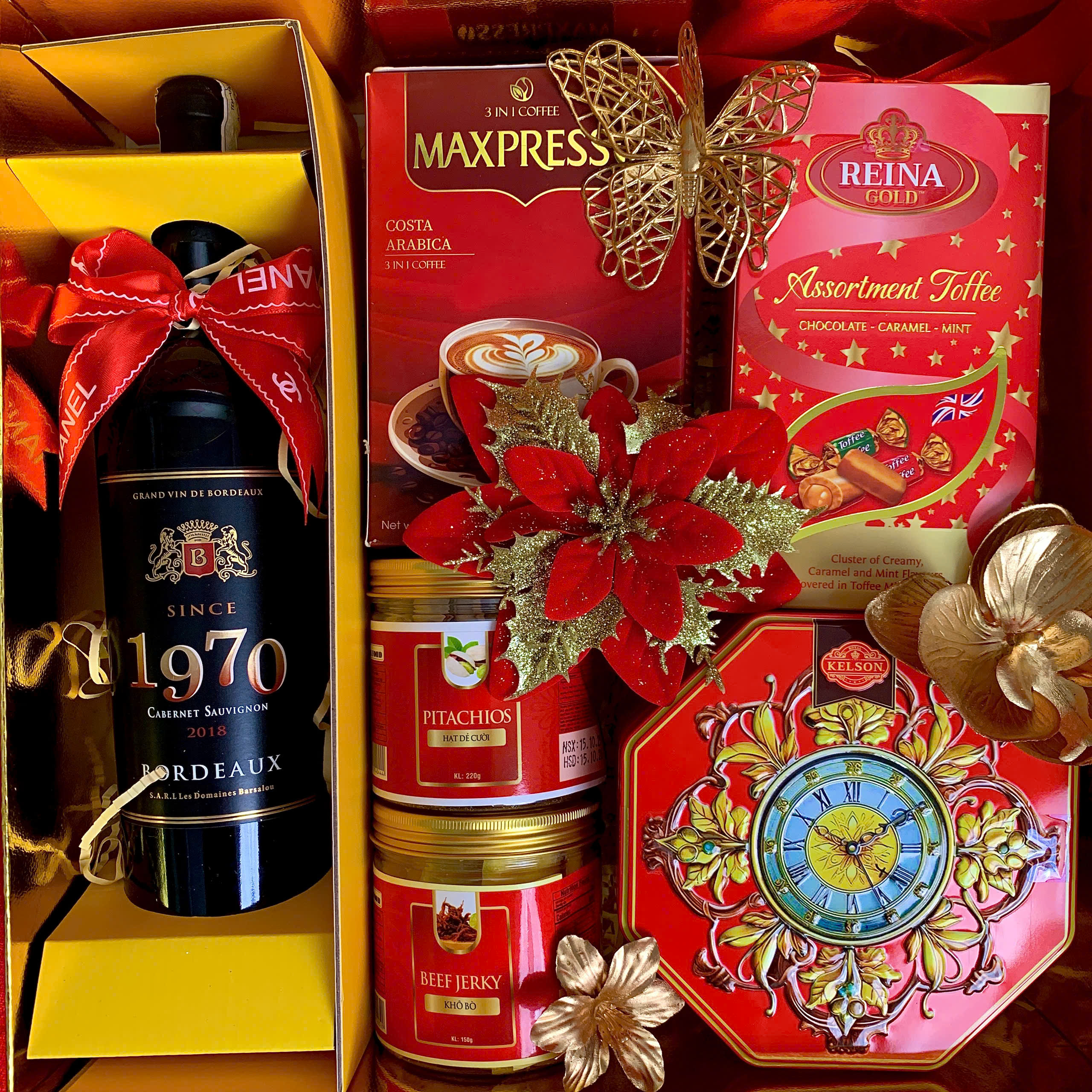 STT Tên sản phẩm Xuất xứ 1 Rượu 1970 Pháp 2 Socola Tiramisu kelson thập cẩm BGĐHỒ 110g x 24 Malaysia 3 Khô Bò Sợi 150g Việt Nam 4 Hạt dẻ cười 250g Việt Nam 5 Cà phê hòa tan Costa 3in1 kiểu Nhật 153g x 36 ĐỎ Việt Nam 6 Kẹo Toffee reina HG NƠ 140g x 25 Malaysia 7 Hộp Quà + Túi Giấy + Bao lì xì + Phụ kiện Hưng Việt Phát 8 In Logo Hộp Quà + Công Gói Hưng Việt Phát