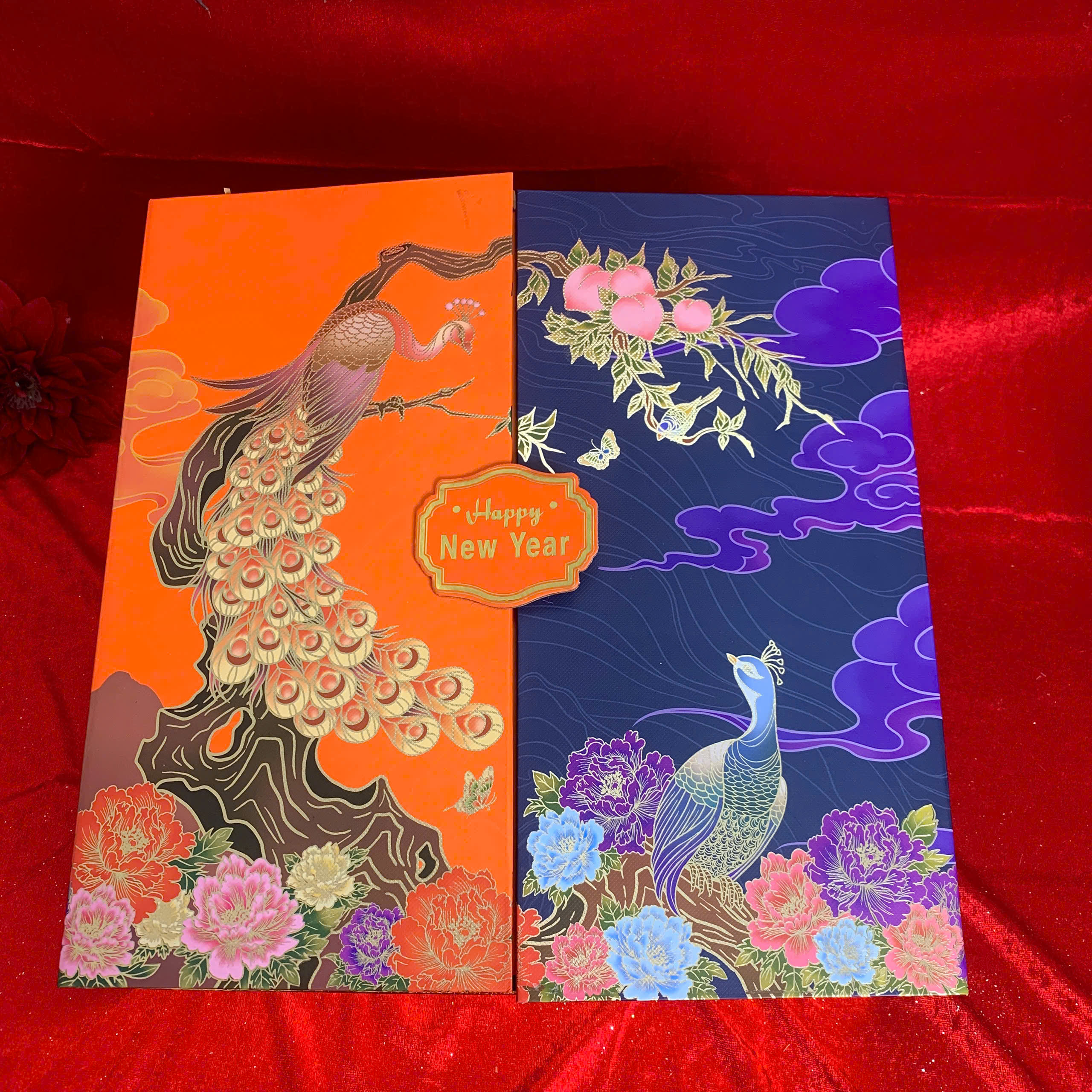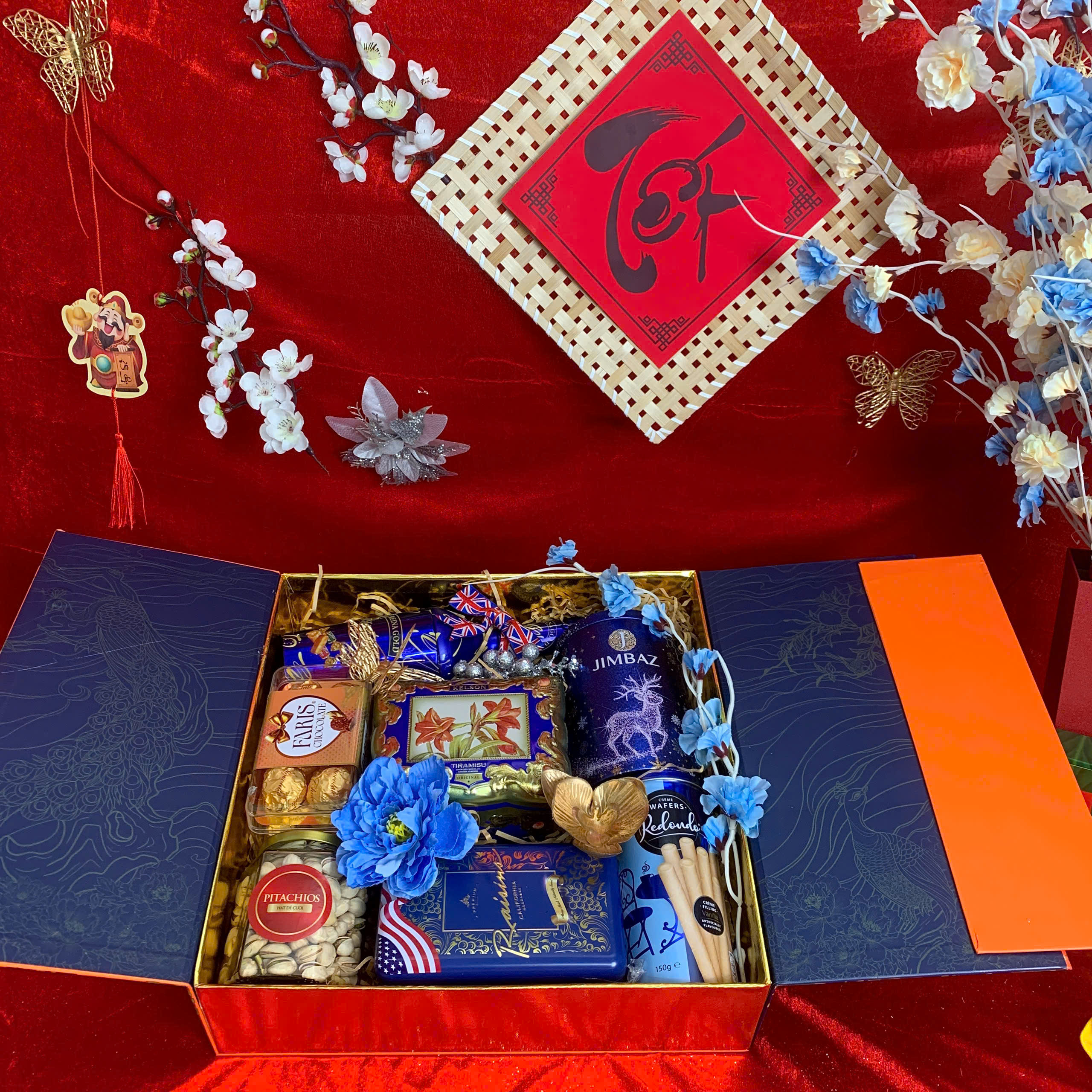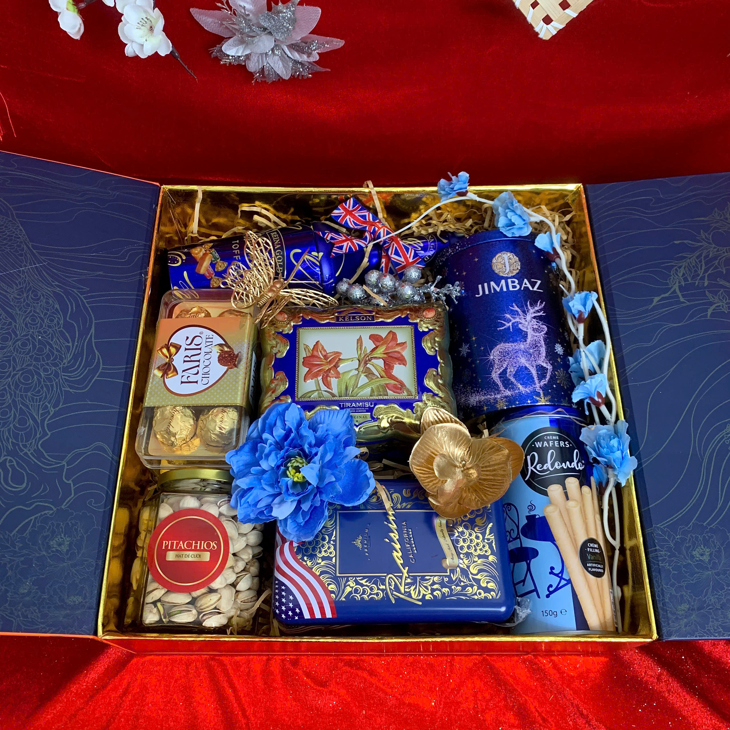 - Thiết kế sang trọng: Hộp quà phối tông đỏ – vàng – xanh dương, tượng trưng cho may mắn, tài lộc và thịnh vượng.